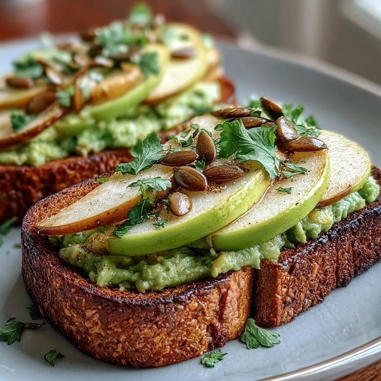 Save to Pinterest One morning, I was standing in front of my nearly empty fridge, listening to the coffee maker sputter, when I spotted a lonely avocado and a green apple that needed rescuing. I'd just bought a bag of pumpkin seeds on impulse at the market, and something about the combination felt right—bright, crisp, and exactly what my tired brain needed. That first bite changed how I thought about breakfast toast entirely.