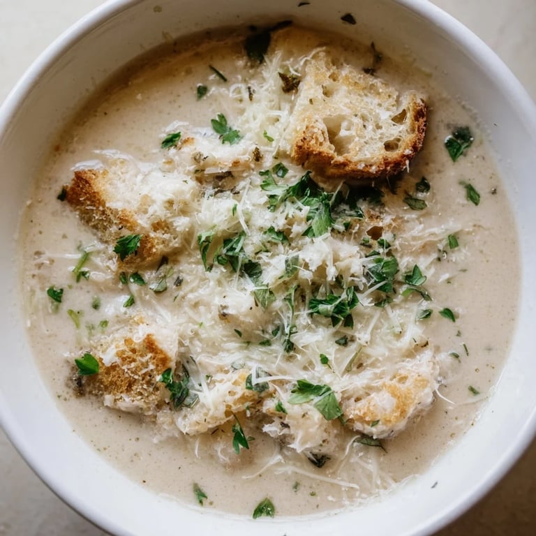 Save to Pinterest My neighbor showed up one autumn evening with a crusty sourdough she'd overbaked, and instead of tossing it, she simmered it into the most luxurious, silky soup I'd ever tasted. That night, I understood something: the best dishes often come from small accidents and open-minded improvisation. Now whenever I have stale bread gathering in my pantry, this creamy garlic soup is the first thing I think of.