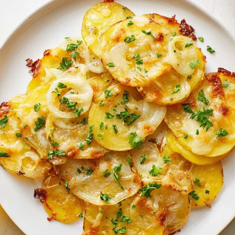 Save to Pinterest My kitchen filled with the most intoxicating smell one autumn evening—not from a fancy recipe, but from layers of golden potatoes and onions that had been slowly turning into liquid gold in the oven. I'd been thinking about French onion soup all week but didn't have bread for the traditional version, so I improvised by layering everything over roasted potatoes instead. That first bite was a revelation: crispy potato edges, sweet caramelized onions, and melted Gruyère all working together like they'd been meant for each other all along.