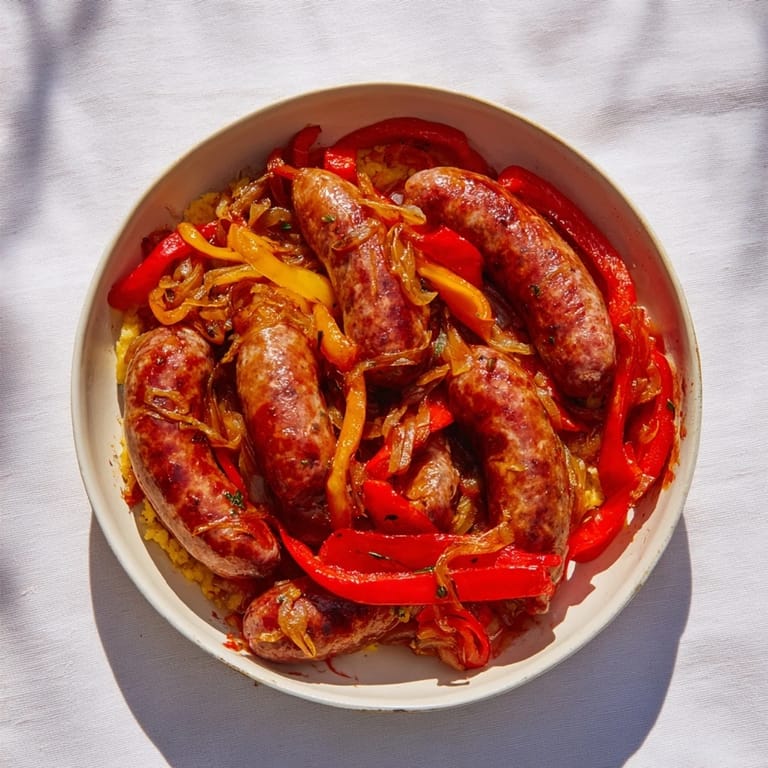 Save to Pinterest A rustic, comforting skillet meal featuring juicy sausages, sweet bell peppers, and onions simmered in a herby tomato sauce, served over creamy polenta. Perfect for a cozy weeknight dinner.