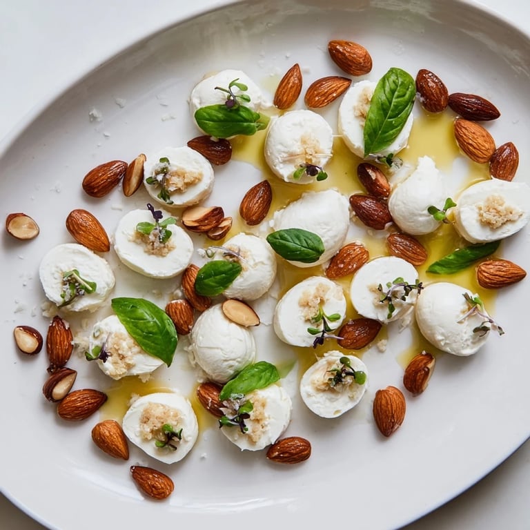 The beauty of this appetizer lives in its visual harmony. Each cheese brings something different—the pure white of fresh mozzarella, the creamy pale tone of goat cheese, the rustic red of babybel, and the warm brown of roasted almonds. When you arrange them thoughtfully, you're not just serving cheese; you're creating a landscape. Take your time with the placement. It doesn't need to be perfect, but it should feel intentional, as if the pieces have naturally found their resting place.