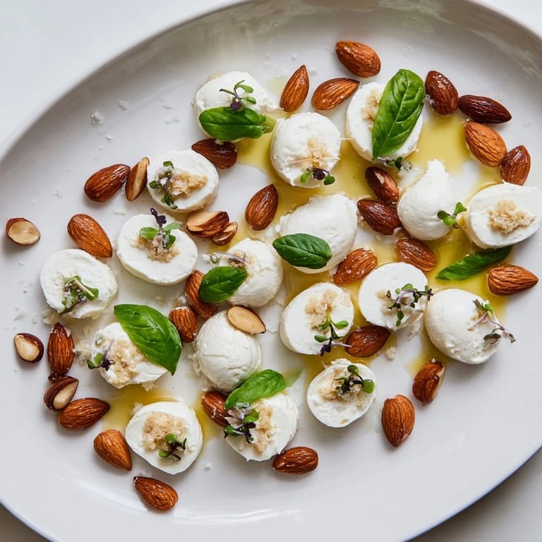 Save to Pinterest I discovered this little appetizer by accident while rearranging my charcuterie board before guests arrived. Instead of the usual scattered arrangement, I noticed how the oval cheeses and roasted almonds naturally formed these beautiful, smooth lines—like a river of pebbles I'd seen once while walking through a garden. It felt playful and unexpected, and everyone immediately leaned in to admire it before they even tasted anything. That moment taught me that sometimes the simplest ingredients become memorable when you arrange them with a little imagination.