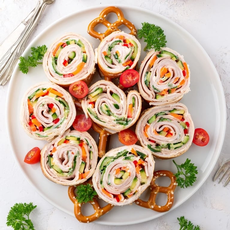Arrange the sliced pinwheels on a large platter starting with a wide base and narrowing to a point for a tree silhouette. Use pretzel sticks for the trunk and garnish with parsley and cherry tomatoes to mimic branches and ornaments.
